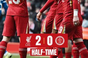 傷停補(bǔ)時(shí)2分鐘。上半場(chǎng)比賽結(jié)束,利物浦2-0阿克靈頓。