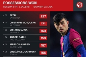 體育資訊4月26日訊 Squawka統(tǒng)計(jì)表明,佩德里是本賽季西甲唯一一個搶回球權(quán)200次以上的球員。