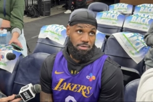 體育資訊4月26日訊 今日,湖人前鋒詹姆斯在投籃訓練后接受了采訪。