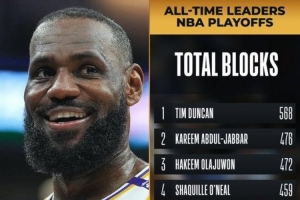 他本場(chǎng)送出1次蓋帽,生涯季后賽蓋帽數(shù)282次,超越麥克海爾升至歷史第九。