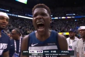 愛德華茲43分對盧卡38分的巨星對轟。兩邊此起彼伏的高潮。湖人下半場沒有換人,五虎拼到結(jié)束。勒布朗打出生涯防守代表作的一節(jié),然后最后一個傳球失誤一個犯規(guī)——犯規(guī)判定還是由芬奇教練挑戰(zhàn)得來——森林狼擊敗湖人。