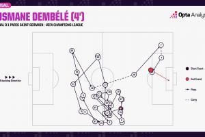 據(jù)Opta統(tǒng)計,登貝萊的進(jìn)球經(jīng)過連續(xù)26次傳球,這是2003-2004賽季有相關(guān)統(tǒng)計以來,巴黎在歐冠連續(xù)傳球次數(shù)最多的進(jìn)球。