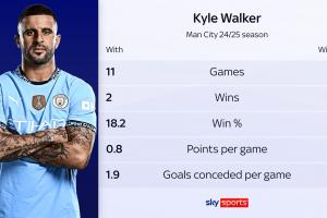 沃克在本賽季狀態(tài)迅速下滑出人意料,天空體育統(tǒng)計了他本賽季出戰(zhàn)和缺戰(zhàn)時曼城的戰(zhàn)績。