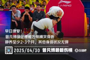 相關(guān)消息源對體育資訊記者透露,曾凡博經(jīng)過多方會診結(jié)果顯示,腰椎左側(cè)橫突骨折。他靜養(yǎng)至少2-3個月,現(xiàn)在很疼,恢復(fù)之后沒啥問題,其他身體狀況無礙。