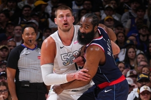 你瞧,周三進(jìn)行的第五場比賽幾乎以非常相似的方式展開。就像他們在周日所做的那樣,掘金隊在第四節(jié)建立了22分的領(lǐng)先優(yōu)勢。快船隊再次縮小了分差。在比賽還剩4分01秒時,掘金隊的領(lǐng)先優(yōu)勢被縮小到了9分。那么,快船隊是如何完成這次險些成功的反撲的呢?他們憑借的是又一個不尋常的防守策略。快船隊讓身高6英尺5英寸(約合1.96米)的后衛(wèi)詹姆斯-哈登去防守約基奇。
