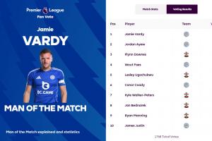英超官方宣布,瓦爾迪當選萊斯特城vs南安普頓球迷票選全場最佳球員。
