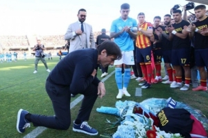 體育資訊5月4日訊 在本輪意甲聯(lián)賽前,那不勒斯主帥孔蒂為上周去世的萊切理療師獻(xiàn)花,并單膝下跪悼念對(duì)方。