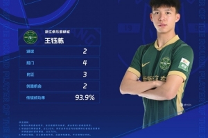 在該輪浙江隊(duì)主場4-2擊敗長春亞泰的比賽中,18歲的王鈺棟上演梅開二度,9輪比賽共斬獲6個進(jìn)球。
