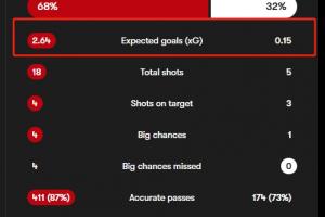 90分鐘的時(shí)間里,阿森納控球率達(dá)到68%,預(yù)期進(jìn)球數(shù)為2.64個(gè),而對(duì)手曼聯(lián)僅為0.15個(gè)。阿森納18腳打門4次射正,曼聯(lián)5腳打門3次射正。