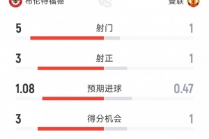 體育資訊5月4日訊 本輪英超曼聯(lián)對陣布倫特福德的比賽上半場結(jié)束,曼聯(lián)暫時1-2落后,以下為雙方半場數(shù)據(jù)對比: