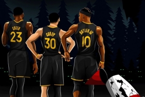 賽后,勇士官推制作海報(bào),庫里追夢巴特勒登封面,眺望遠(yuǎn)方的狼(森林狼),而火箭被干翻在地。