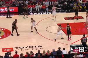 踩庫里腳,致庫里掉鞋,庫里想穿鞋,又被狄龍一屁股拱出去,科爾無奈喊停,庫里也挺無語默默把鞋穿上