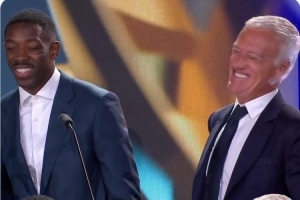 在頒獎儀式上,登貝萊和法國國家隊教練德尚開起了玩笑。