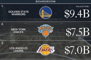 其中金州勇士市值估值高達(dá)94億美元高居聯(lián)盟第一,尼克斯估值為75億美元排名第二,湖人估值70億美元排名第三。
