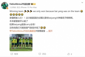 體育資訊5月14日訊 國安球員法比奧曬球隊訓練勝利小分隊合照,并調侃了柏楊。