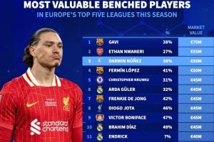 體育資訊05月16日訊 德國轉(zhuǎn)會市場網(wǎng)站統(tǒng)計了五大聯(lián)賽身價最高的20名替補(bǔ)球員,巴薩中場加維排名第一,阿森納小將恩瓦內(nèi)里排名第二,努涅斯排名第三。