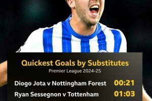 體育資訊5月20日訊 在本輪英超布萊頓3-2擊敗利物浦的比賽中,辛謝爾伍德在替補登場1分18秒破門,此數(shù)據(jù)位列本賽季英超第4,以下為本賽季英超替補登場最快進球榜: