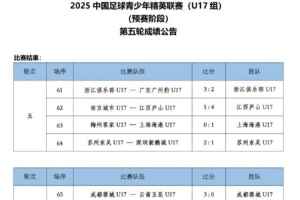 體育資訊5月21日訊 2025中國(guó)足球青少年精英聯(lián)賽(U17組)預(yù)賽階段第5輪已經(jīng)結(jié)束,本輪恒大足校、武漢三鎮(zhèn)U17、泰山U17B隊(duì)均以6-0的比分大勝對(duì)手。