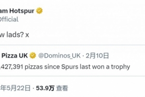 達美樂披薩英國官方社媒在今年2月份曾發(fā)文:“自從上次熱刺贏得冠軍以來,我們已經(jīng)售出了78427391份披薩?!?/p>
