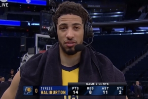 體育資訊5月24日訊 東部決賽G2,步行者114-109力克尼克斯大比分2-0領先。賽后,哈利伯頓接受了采訪。