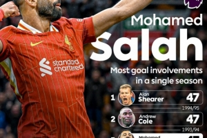 據統(tǒng)計,薩拉赫本賽季英超直接參與47粒進球(29球18助),追平了希勒與科爾共同保持的單賽季英超歷史紀錄,他也是首位在38場英超做到這一點的球員。