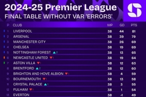 根據(jù)投票結(jié)果,Squawka列出本賽季英超聯(lián)賽若無(wú)VAR誤判情況下的積分榜,利物浦81分奪冠,阿森納79分次席,曼城第三。諾丁漢森林將參加下賽季歐冠,紐卡踢歐聯(lián),維拉踢歐協(xié)聯(lián)。