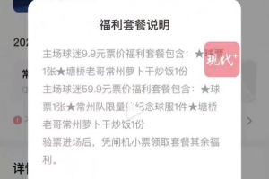 按照賽事安排,5月31日,常州隊將在主場常州工學院體育場對陣揚州隊。據(jù)售票信息顯示,球迷9.9元福利套餐包含常州蘿卜干炒飯1份、59.9元套餐含常州隊限量款球衣。
