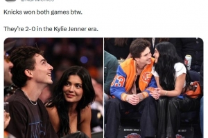 美媒NBA Memes曬出一組趣味數(shù)據(jù),當(dāng)凱莉-詹娜陪男友甜茶現(xiàn)場看球時,尼克斯的戰(zhàn)績?yōu)?勝0負。