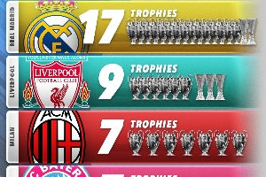 1、皇馬,17冠(15歐冠+2歐聯(lián))