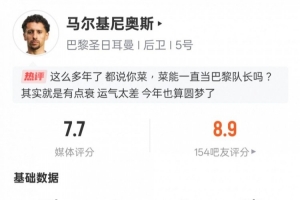 體育資訊6月1日訊 歐冠決賽,巴黎圣日耳曼5-0國(guó)際米蘭,馬爾基尼奧斯首發(fā)出戰(zhàn),貢獻(xiàn)9次解圍,傳球成功率95.6%,4次爭(zhēng)頂成功全場(chǎng)最多,評(píng)分7.7。
