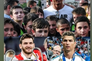 克瓦拉茨赫利亞在個(gè)人社媒曬出兒時(shí)與偶像C羅的合影,以及兩人分別手捧歐冠冠軍獎(jiǎng)杯的照片。
