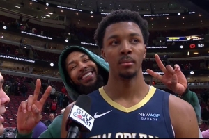 賽后,本場表現(xiàn)出色的特雷-墨菲在場邊接受采訪,英格拉姆在其身后搶鏡,笑容溫暖純真。