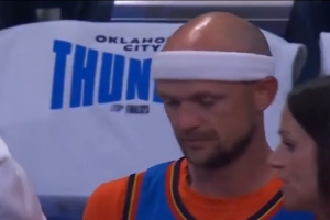 賽前,鏡頭捕捉到現(xiàn)場來了一位球迷,發(fā)型和裝扮模仿了雷霆悍將卡魯索。