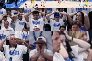 賽后,美媒及一些記者曬出了現(xiàn)場雷霆球迷在親眼看到主隊(duì)被絕殺時(shí)的表情,抱頭捂腮幾乎成為標(biāo)配。