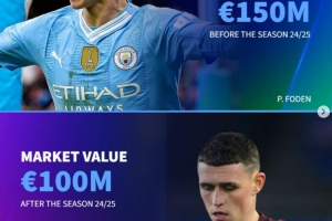 福登(曼城),現(xiàn)身價(jià)1億歐,賽季前1.5億歐,-5000萬(wàn)歐