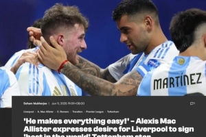 體育資訊6月12日訊 麥卡利斯特沒有入選本期阿根廷國家隊(duì)大名單,他獲得了休息。在接受采訪時(shí),麥卡對(duì)國家隊(duì)隊(duì)友、熱刺后衛(wèi)羅梅羅大加贊賞。
