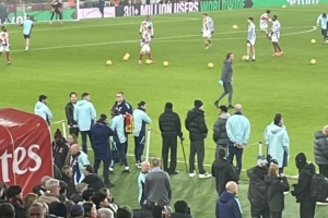 賽前熱身階段,薩卡被拍到在場邊拄拐觀看球隊(duì)熱身。