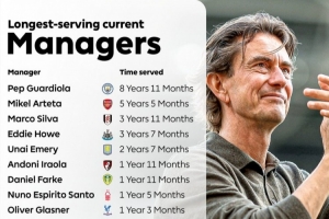 據(jù)英超官方統(tǒng)計,瓜迪奧拉是當前執(zhí)教時間最長的主帥,阿爾特塔次席,馬爾科-席爾瓦第三。