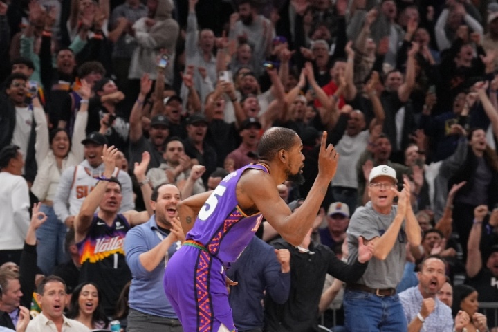 2024-25賽季,36歲的杜蘭特為太陽出戰(zhàn)62場常規(guī)賽,場均上場36.5分鐘可以砍下26.6分6籃板4.2助攻0.8搶斷1.2蓋帽,三項命中率分別是52.7%、43.0%和83.9%。