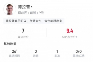 此役,德拉普替補登場踢了26分鐘,送出1個助攻,他5次丟失球權(quán),1次越位,14次觸球,8次傳球,送出2次關(guān)鍵傳球,傳球成功率75%,傳中1次,犯規(guī)2次,3次地面對抗均未成功。