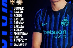 國米首發(fā):1-索默、15-阿切爾比、28-帕瓦爾、30-卡洛斯-奧古斯托、36-達米安、95-巴斯托尼、21-阿斯拉尼、22-姆希塔良、23-巴雷拉、10-勞塔羅-馬丁內(nèi)斯、70-S-埃斯波西托