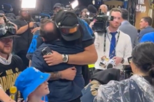 賽后,雷霆球員杰林-威廉姆斯抱起了球隊記者Nick Gallo。后者經(jīng)常在現(xiàn)場采訪雷霆球員,隊員們也喜歡“整蠱”這位記者。