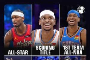 本賽季,亞歷山大分別獲得以下榮譽:全明星、得分王、最佳一陣、常規(guī)賽MVP、西決MVP、總決賽MVP。