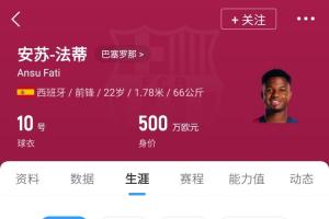 22歲的法蒂上賽季僅代表巴薩出戰(zhàn)11場比賽,共計298分鐘,0球0助,球員巔峰身價8000萬歐,如今只剩500萬歐。