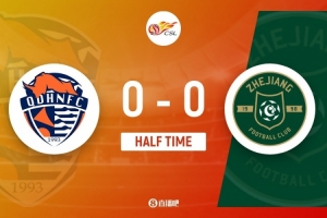 傷停補時2分鐘。上半場比賽結(jié)束,青島海牛0-0浙江。