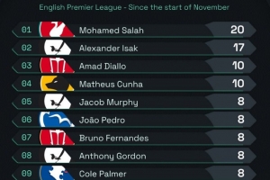 體育資訊1月17日訊 在本輪英超曼聯(lián)3-1擊敗南安普頓比賽中,阿瑪?shù)律涎菝弊討蚍?。以下為?1月以來(lái)英超參與進(jìn)球榜(進(jìn)球+助攻),具體如下: