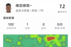 體育資訊1月17日訊 西班牙國(guó)王杯1/8決賽,皇馬對(duì)陣塞爾塔,維尼修斯首發(fā)出戰(zhàn),貢獻(xiàn)1粒進(jìn)球,送出2次關(guān)鍵傳球,還有2次過(guò)人成功,但也有1次錯(cuò)失進(jìn)球機(jī)會(huì)和20次丟失球權(quán),評(píng)分7.2。