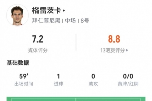 體育資訊6月30日訊 拜仁在世俱杯16強戰(zhàn)3-2領(lǐng)先弗拉門戈,格雷茨卡本場數(shù)據(jù)如下: