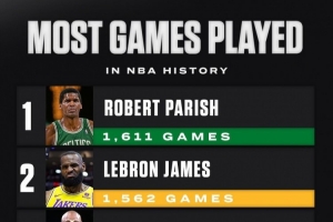 體育資訊7月1日訊 ?詹姆斯已經(jīng)執(zhí)行了下賽季的球員選項,參照詹姆斯生涯的出勤率,詹姆斯有很大的概率在下賽季超越羅伯特-帕里什,成為NBA歷史上常規(guī)賽出場數(shù)第一的球員。