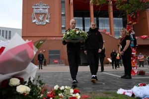 她們還代表球隊(duì)獻(xiàn)上了一個(gè)花圈,加入到過去幾天里放置在安菲爾德球場(chǎng)外的大量悼念物品之中。